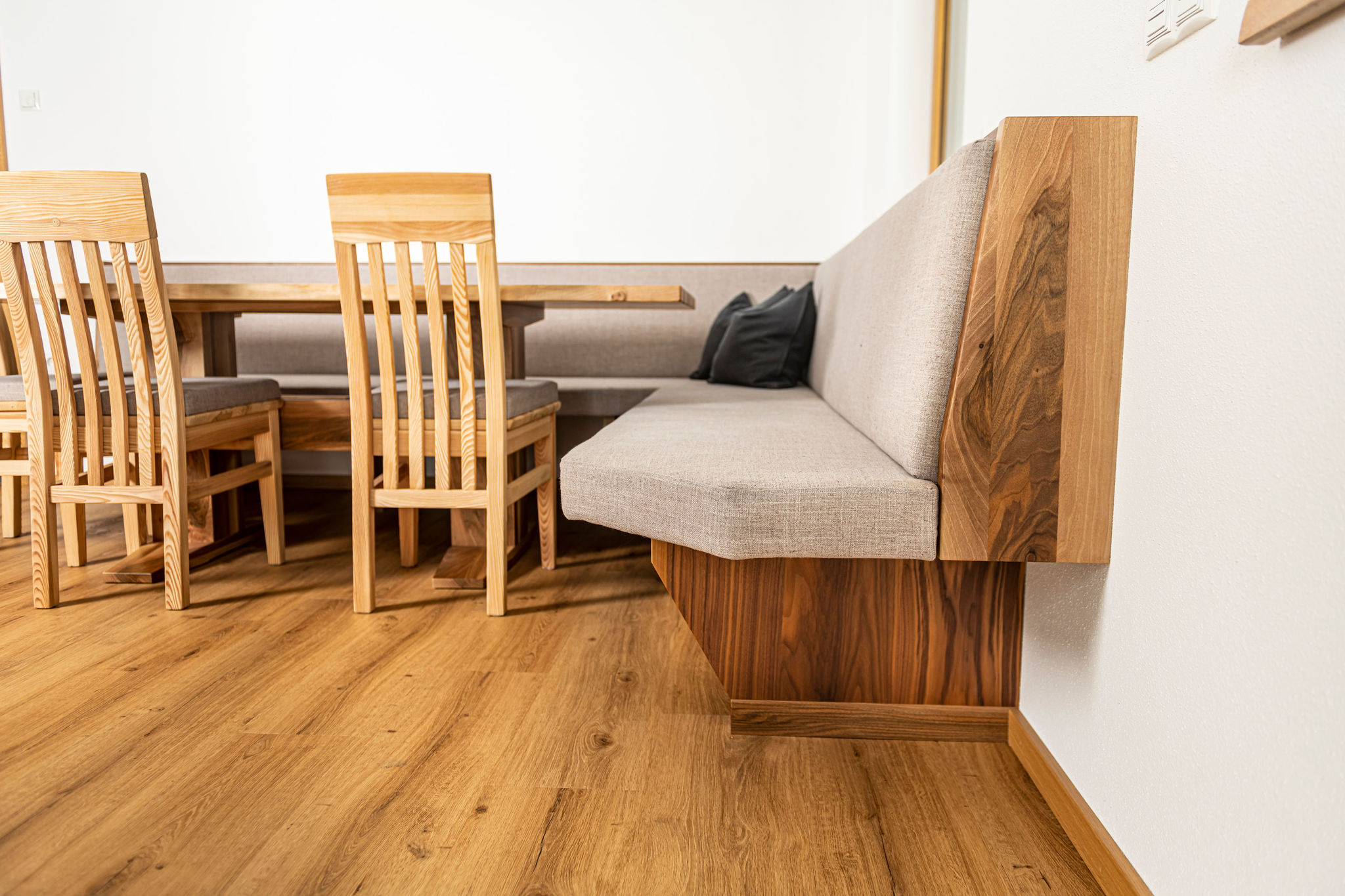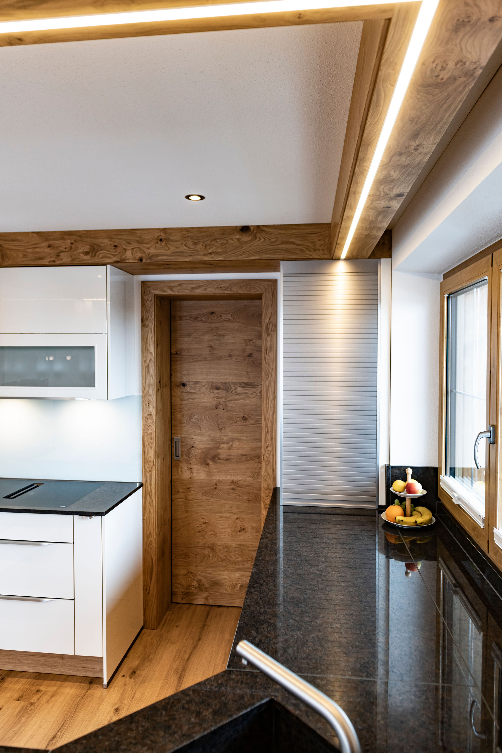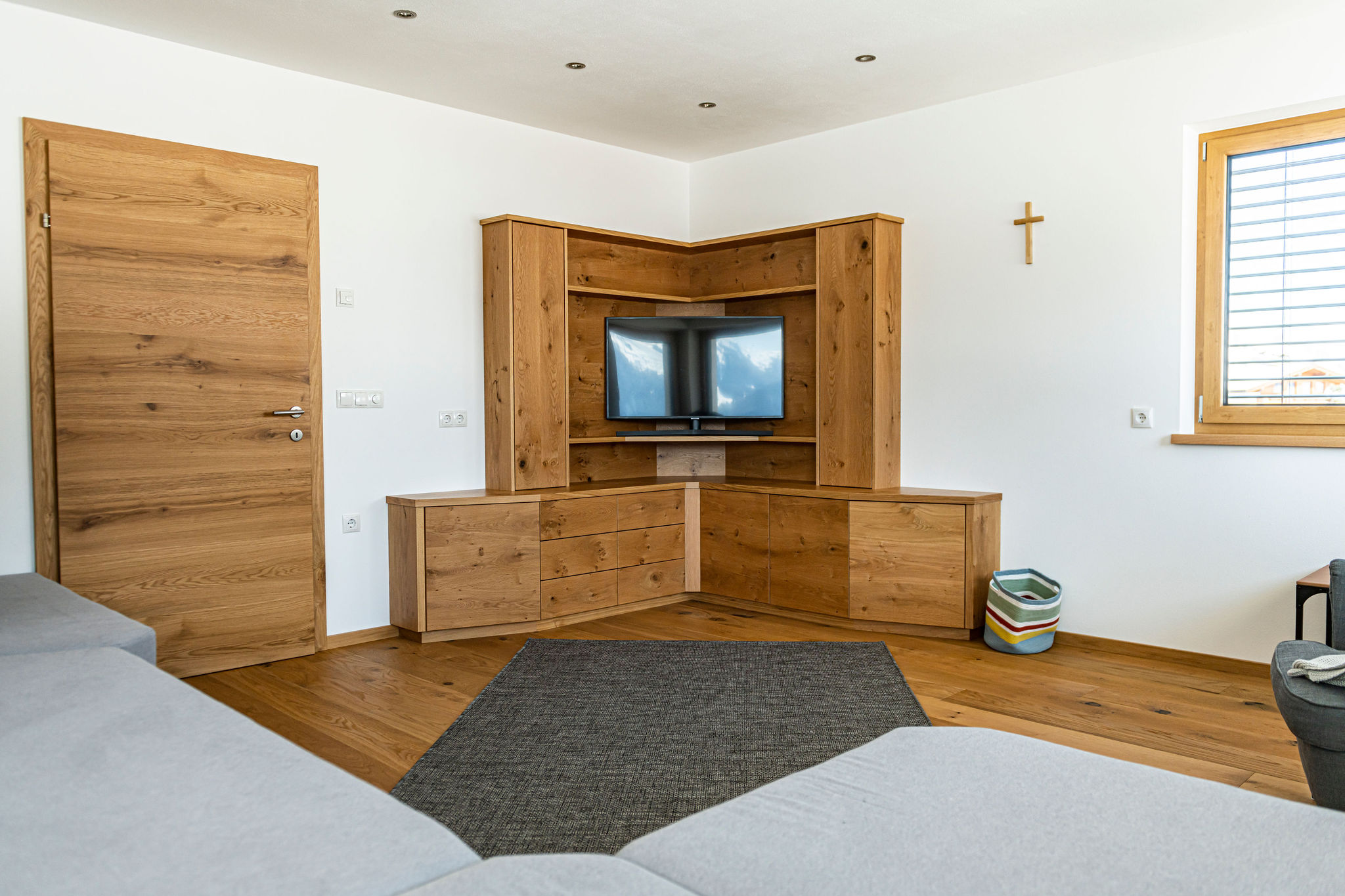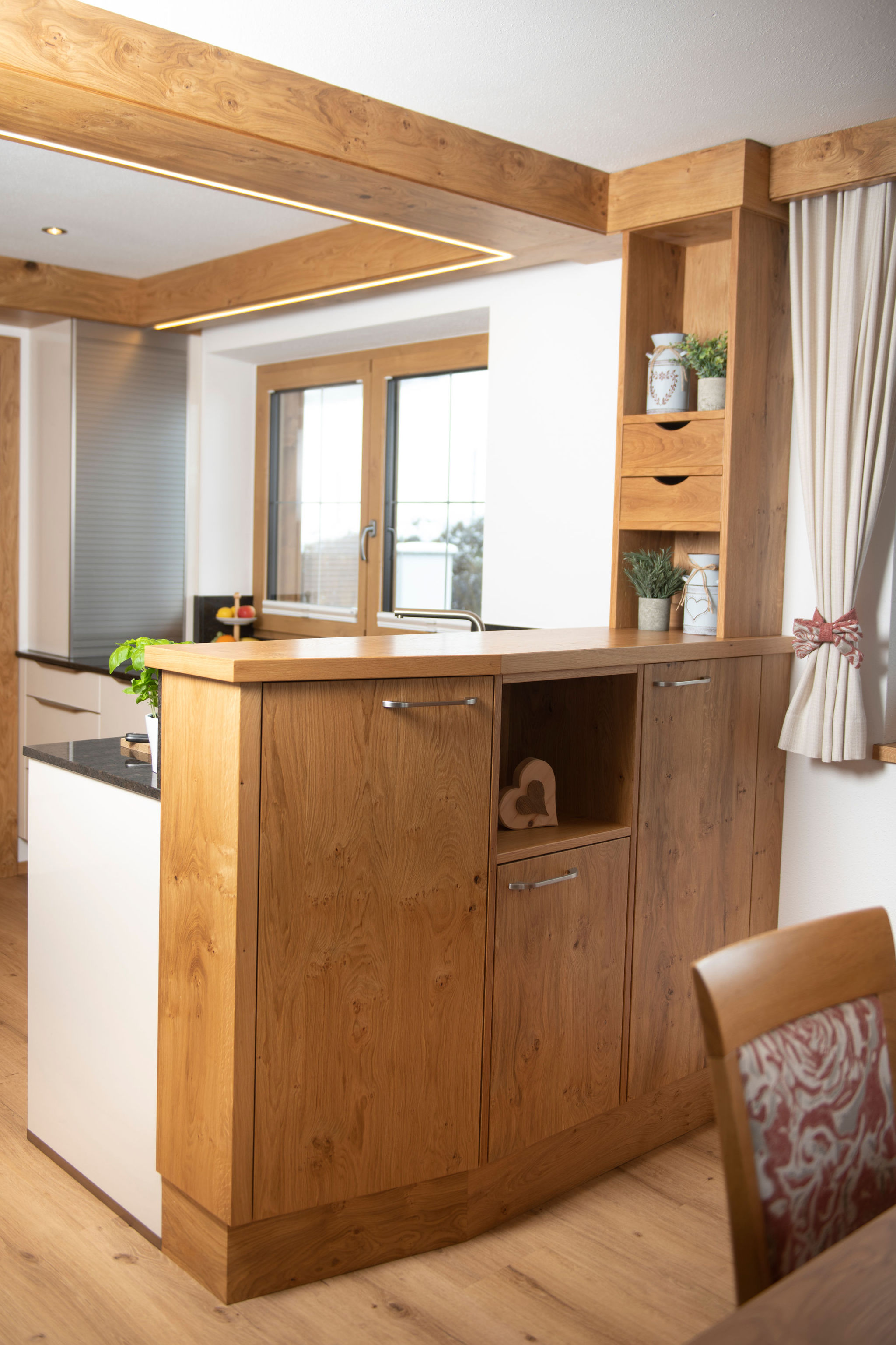 Dazu gehören hochwertige Deckenverkleidungen im Wohnzimmer, maßgeschneiderte Garderoben sowie stilvolle und funktionale Einrichtungen für Schlafzimmer, Kinderzimmer und Küchen.